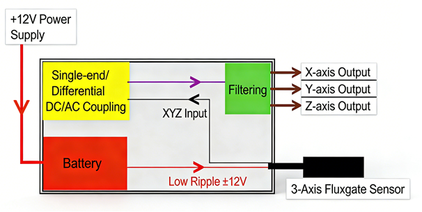 Power Supply Output Voltage | Ultra-low noise isolated ±12V, ±100mA (for fluxgate sensor power supply) |